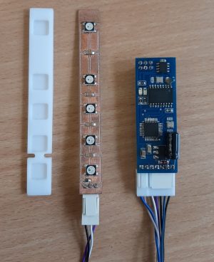 The controller is designed to dynamically display the engaged position of the automatic transmission selector. The controller connects to the CAN bus MS-CAN and analyzes data packets, turning on the lamps at the right time. The brightness of the backlight is tied to the overall brightness in the car and can be adjusted with standard buttons along with all devices.